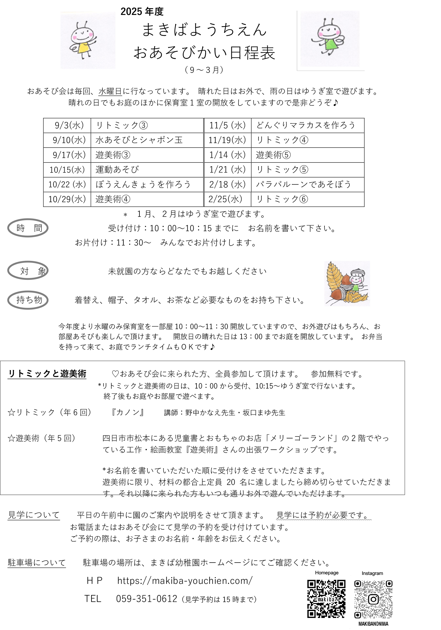 まきば幼稚園が気になるなと思っていただいた方、どこかで遊べる場所はないかなとお探しの方、子育てをしている方とお話したいなと思われている方、ぜひ一度遊びに来てください。